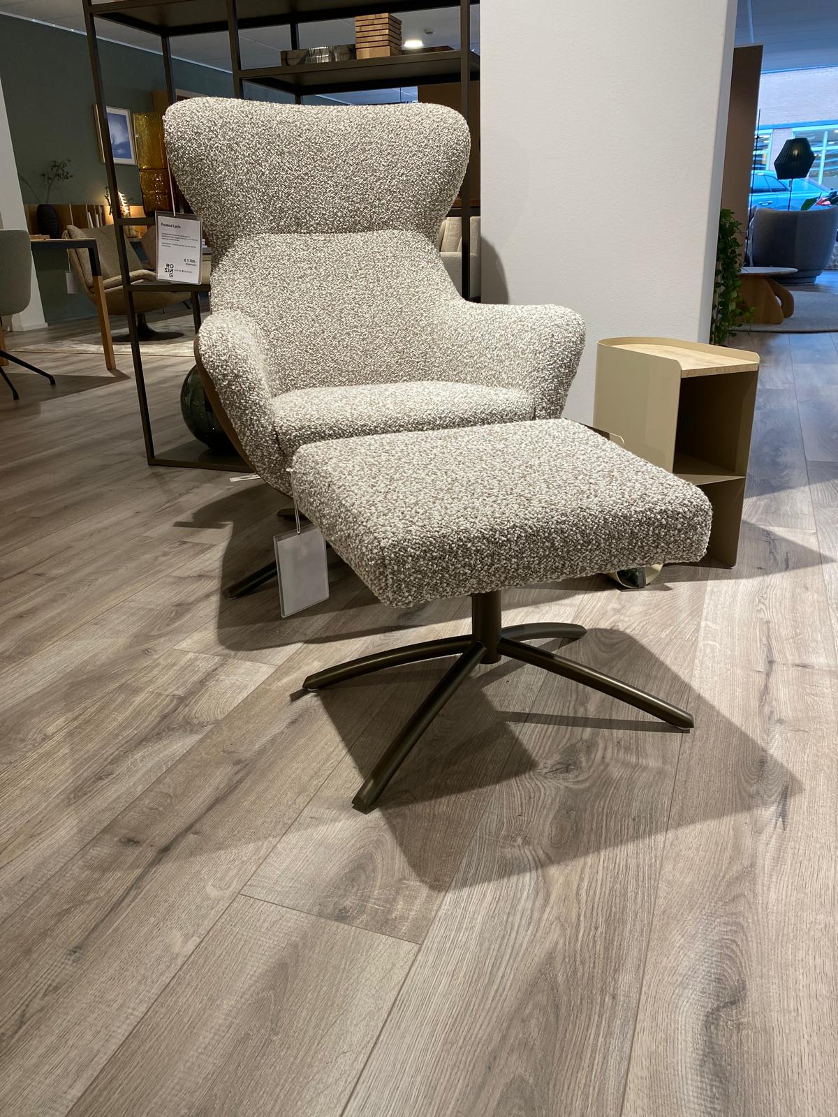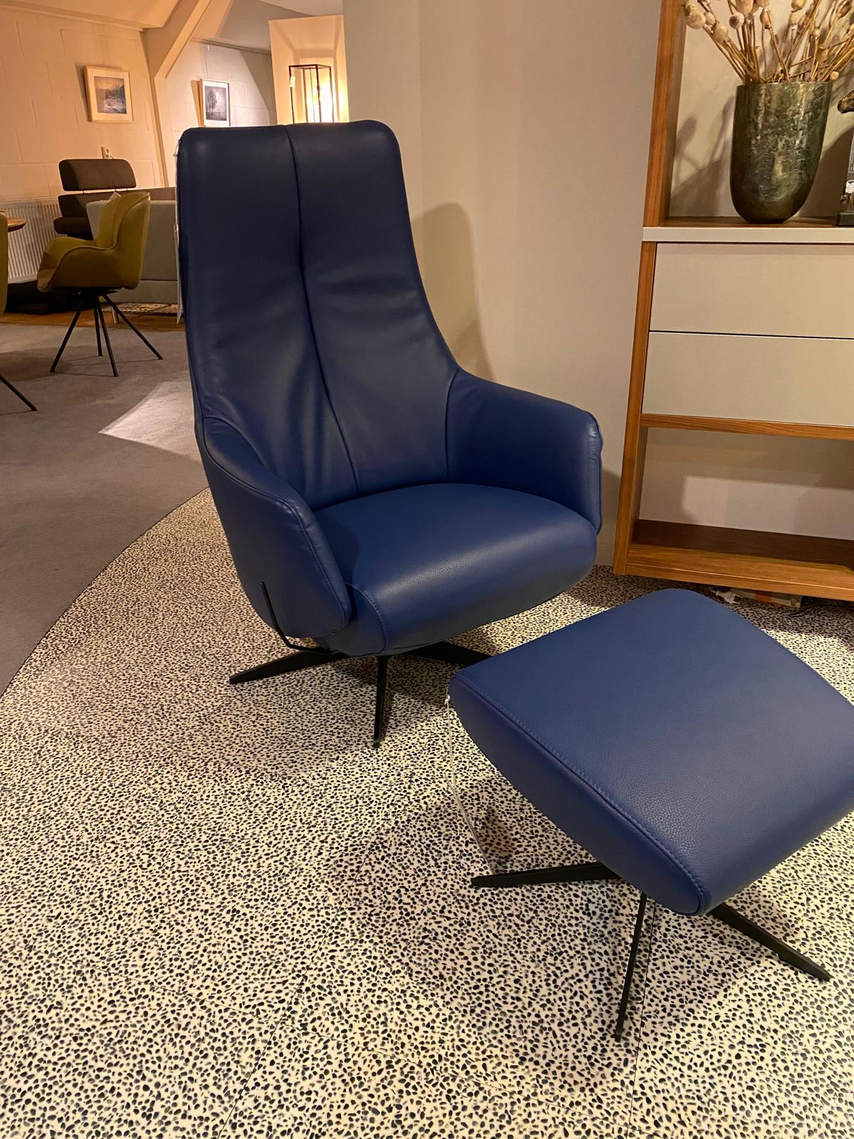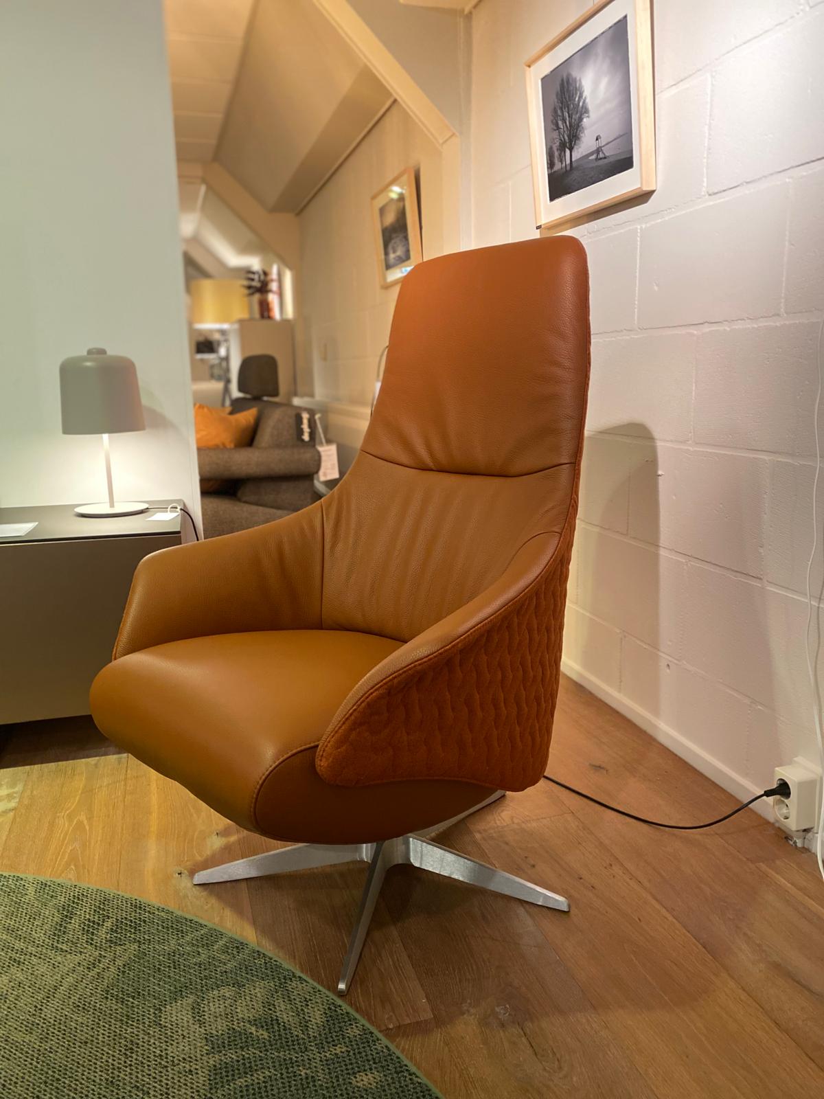 Fauteuil leer/stof combinatie, hocker stof